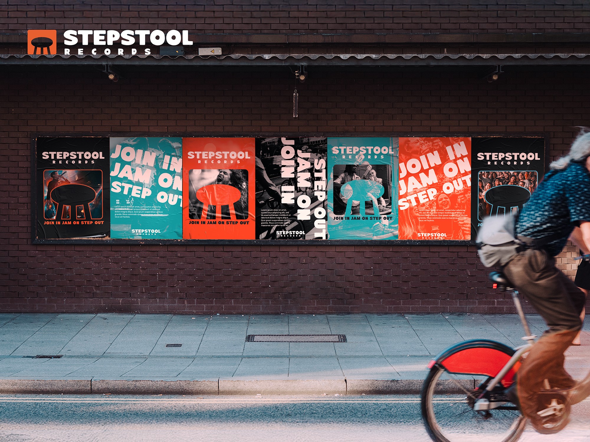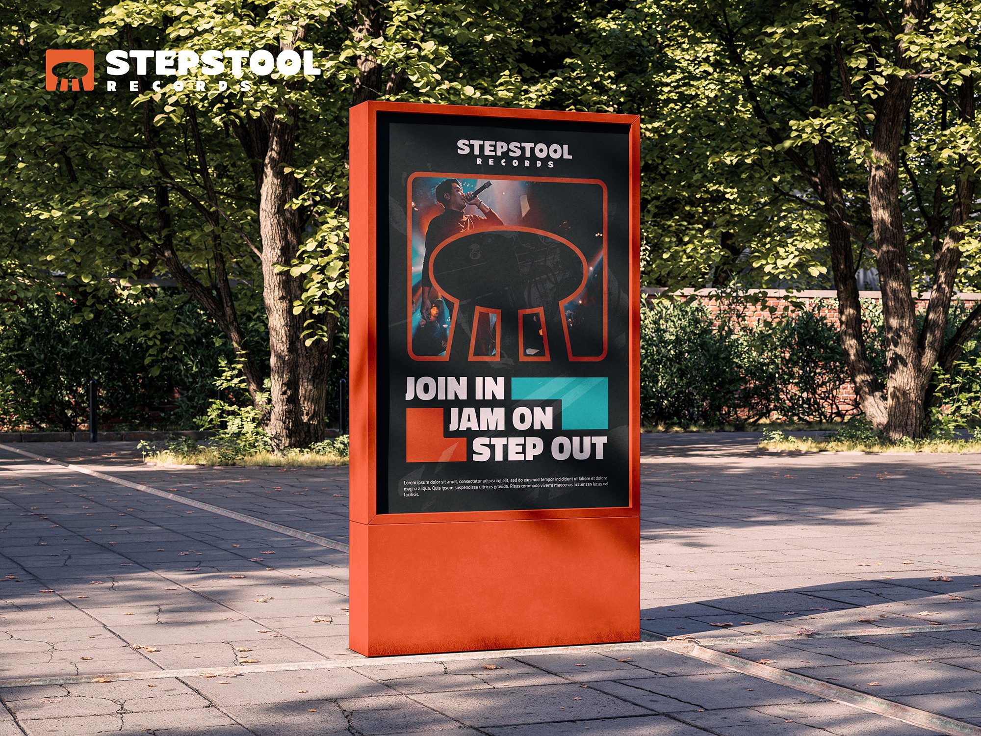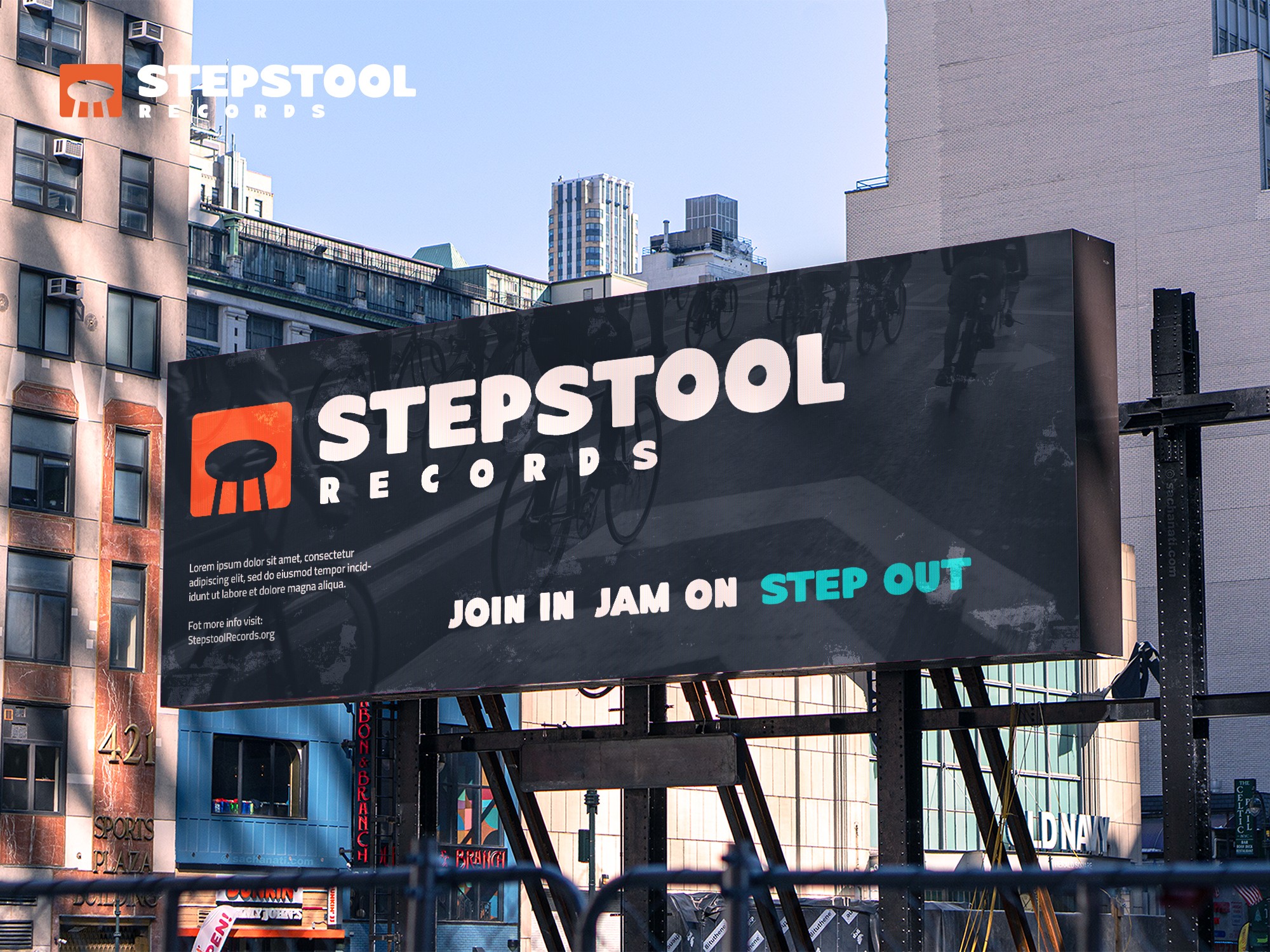 The name Stepstool Records reflects their mission to elevate smaller artists and communities. I explored various abstract representations of this concept before landing on a solution that integrates a stepstool into the negative space of the logo. This approach creates strong contrast, high recognition, and a clear nod to their name.